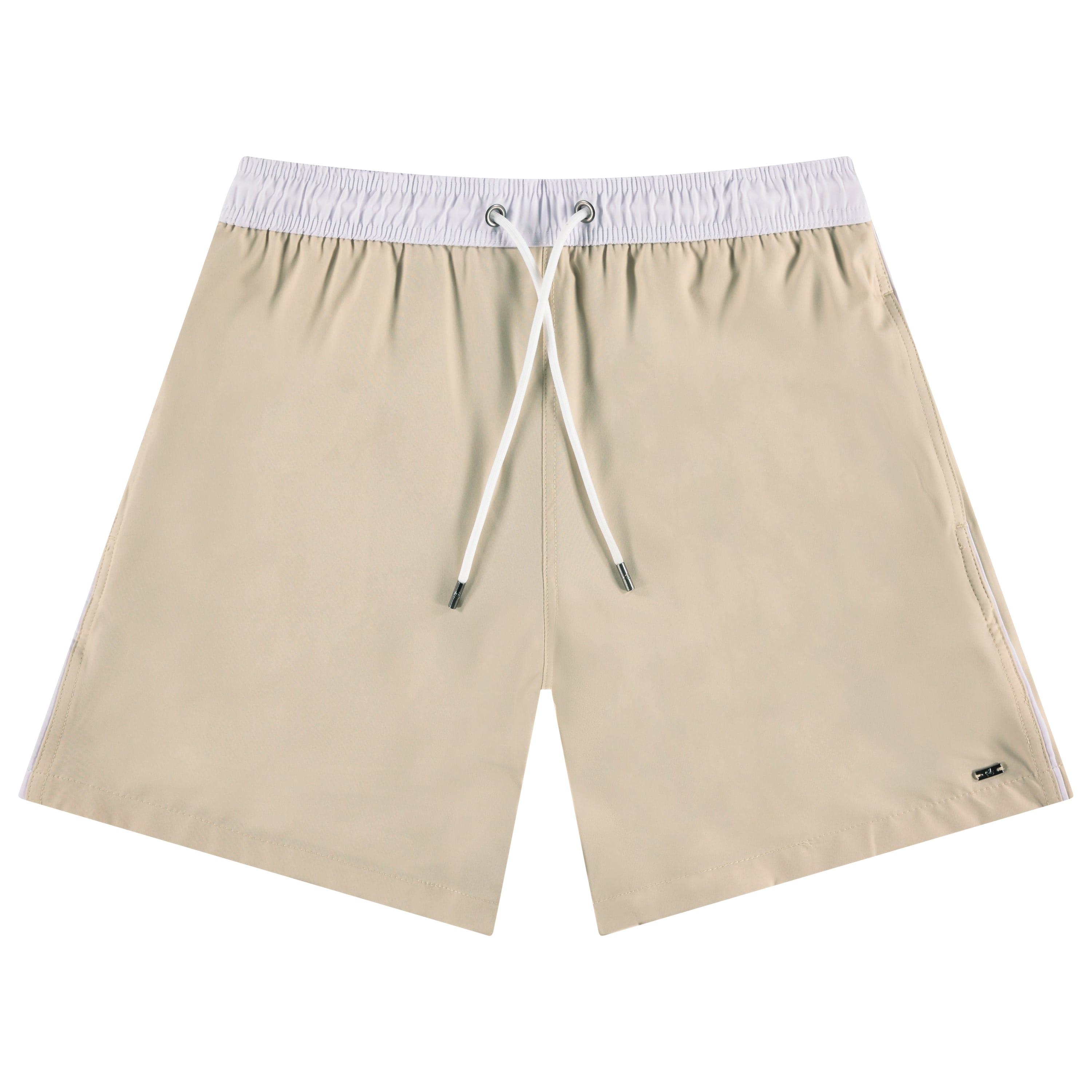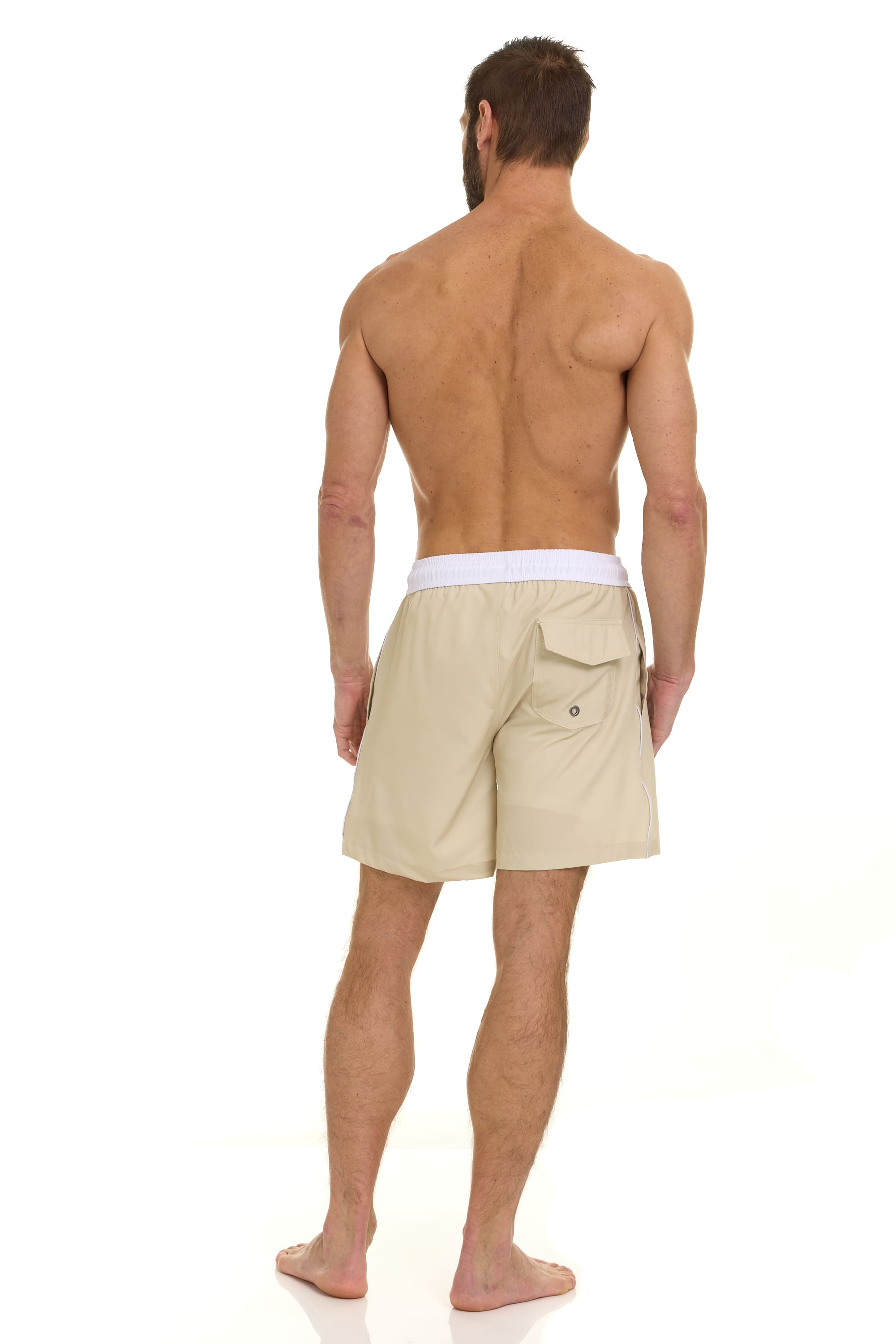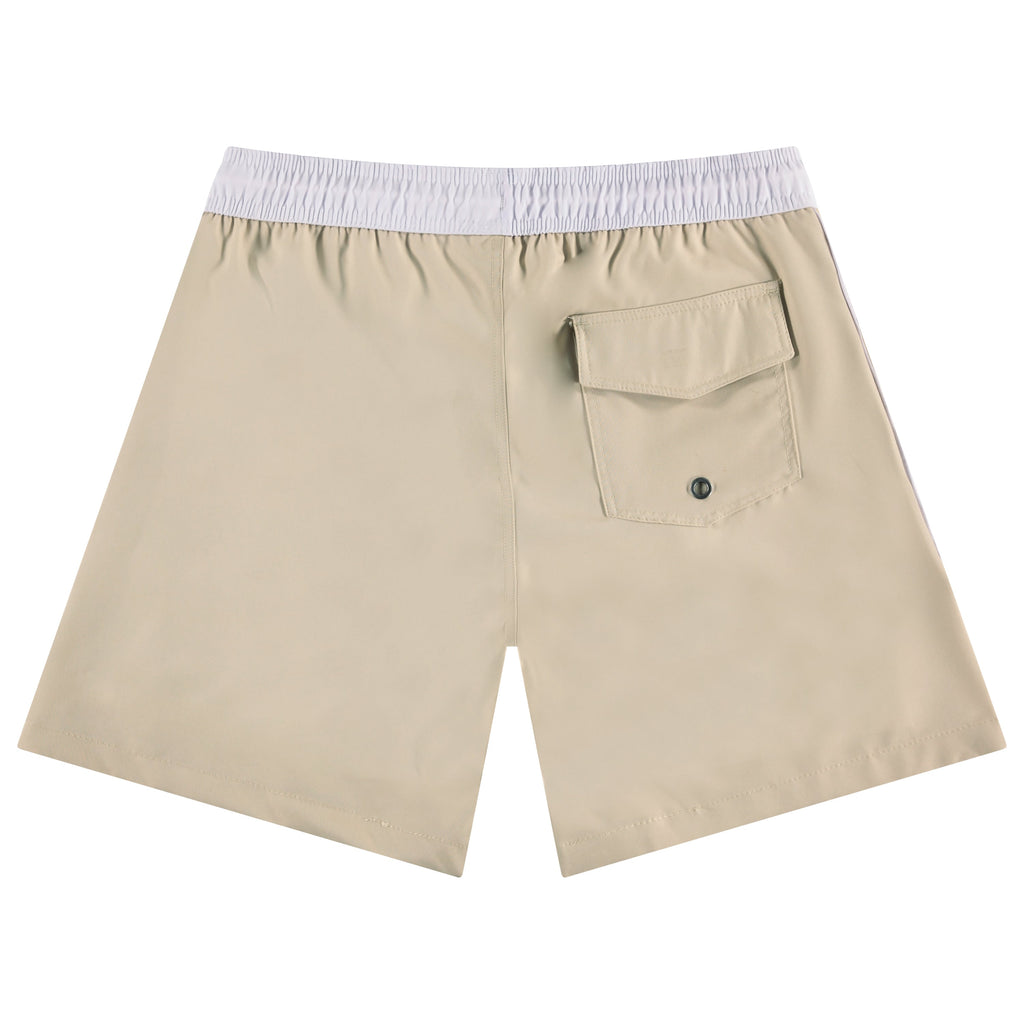 - Our swim shorts come equipped with two side pockets and a back pocket outfitted with a velcro tab.